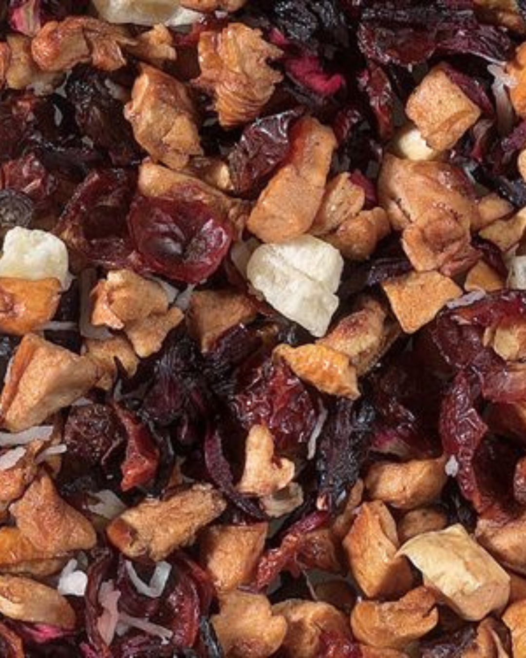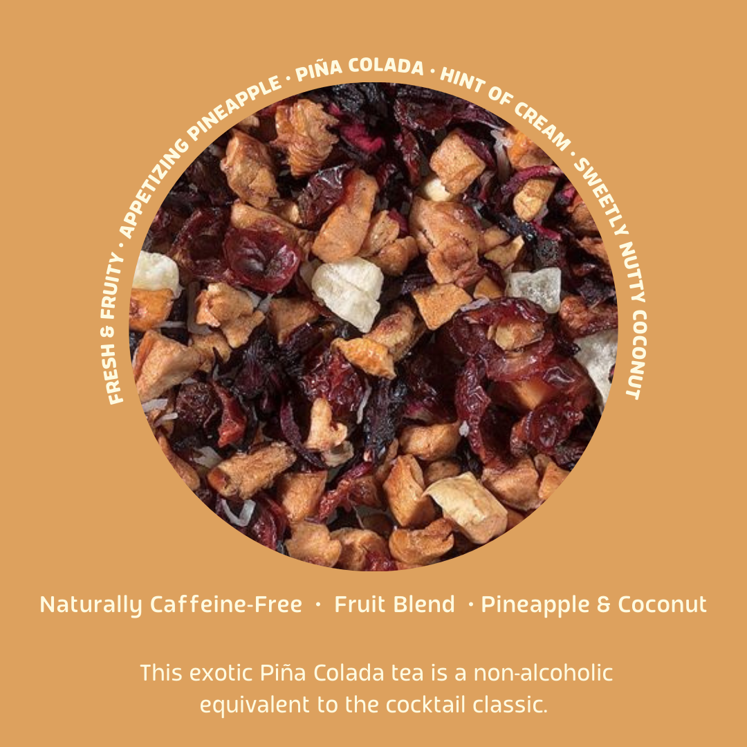 The non-alcoholic equivalent to the popular and world-famous cocktail classic is hot on the trail of its counterpart. A lively, fresh and fruity taste thanks to appetizing pineapple, a hint of cream, as well as a dash of fine, sweetly nutty coconut aroma are the secrets of this very delicious tea variety. The exotic Piña Colada tea has turned into a classic very quickly, and truly belongs to our all-time hot sellers. This highly attractive tea creation should not be missing in any standard assortment. This hot cocktail is a must; try it on a green tea or Rooibos tea basis as well!