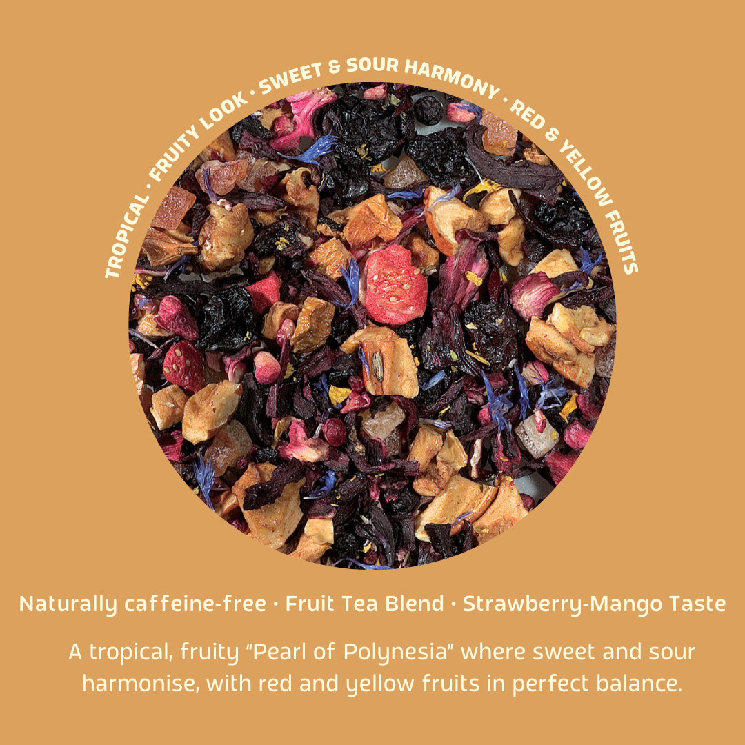 This creation is the ‘Pearl of Polynesia’, which is how the volcanic island of the same name is known, and features a tropical, fruity look. We have enriched many exquisite fruits of local and exotic origin with bright blossoms in blue and yellow and then enhanced them with the finest flavours of southern fruits. Sweet and sour harmonise brilliantly here! Red and yellow fruits complement each other beautifully! An absolute hit in our very varied product range.