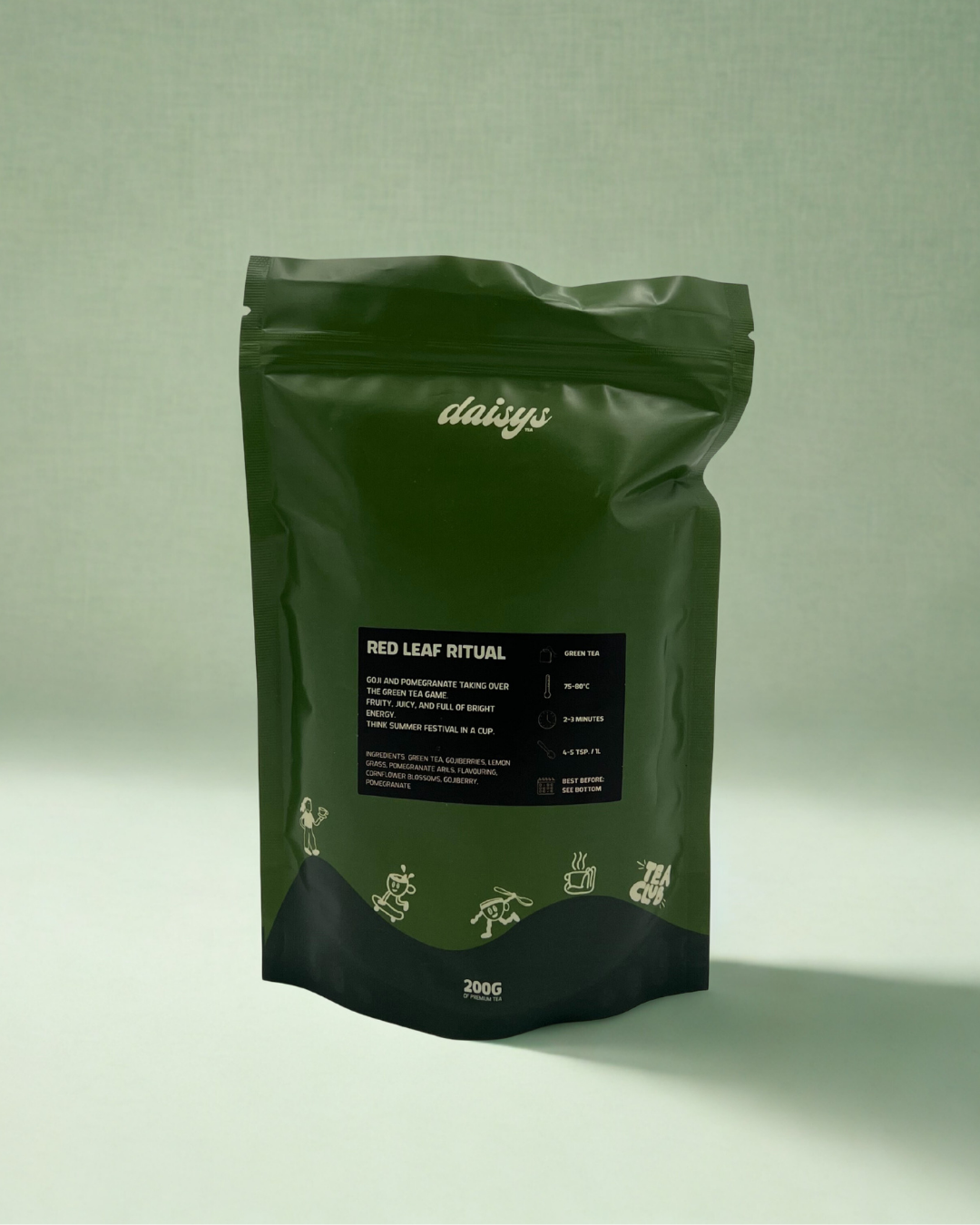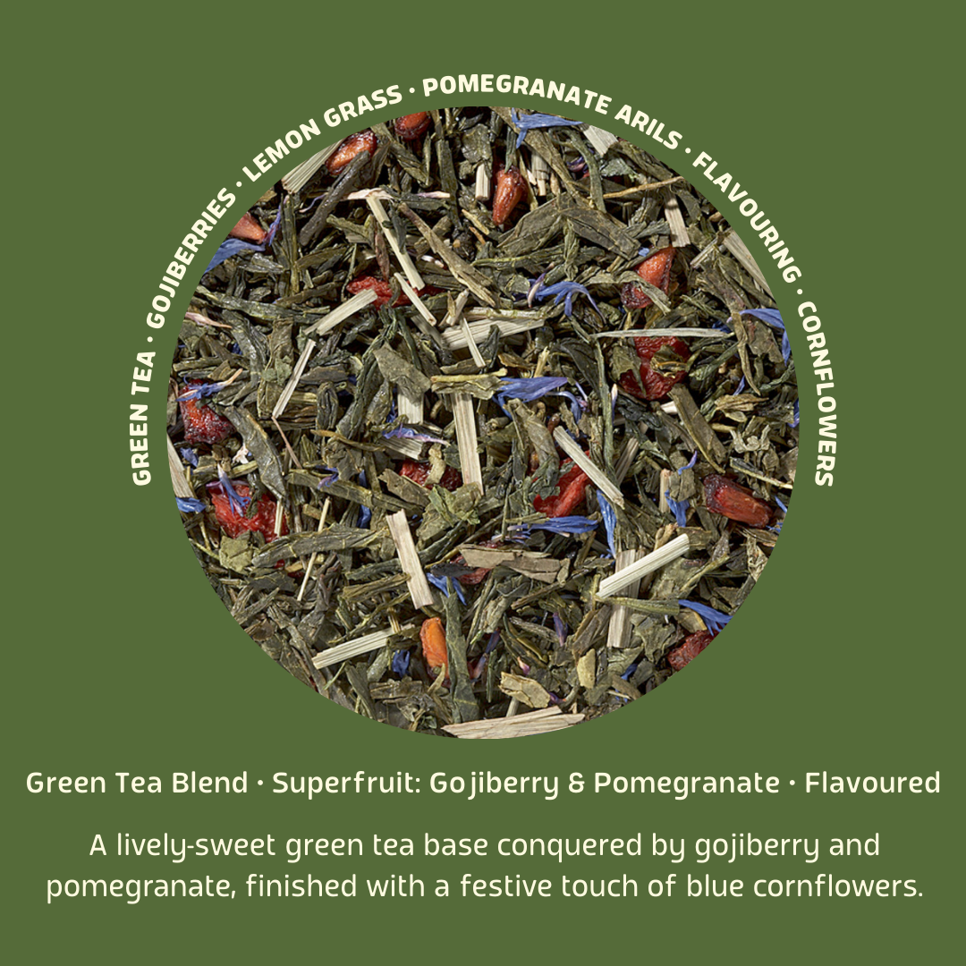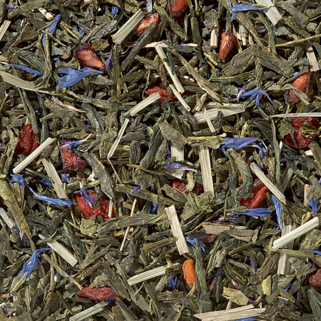 Gojiberry and pomegranate are both glowing with pride as they have just conquered our green tea base! The result: a race to the top of the chart thanks to their very berry, fruity, lively-sweet power. The award ceremony takes place on the green bed of the playing field: a glowing garland made of blue cornflowers and a festive march of the top teams of the league.