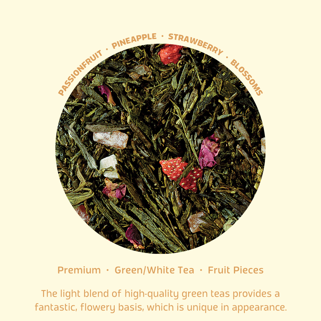 You must see and enjoy this heavenly tea. The light blend of high-quality green teas provides a fantastic, flowery basis, which is unique in appearance. The flavours of passionfruit, pineapple and strawberry form a perfect symbiosis with the base. The fruit pieces and blossoms add to the attraction. A tea made for angels.