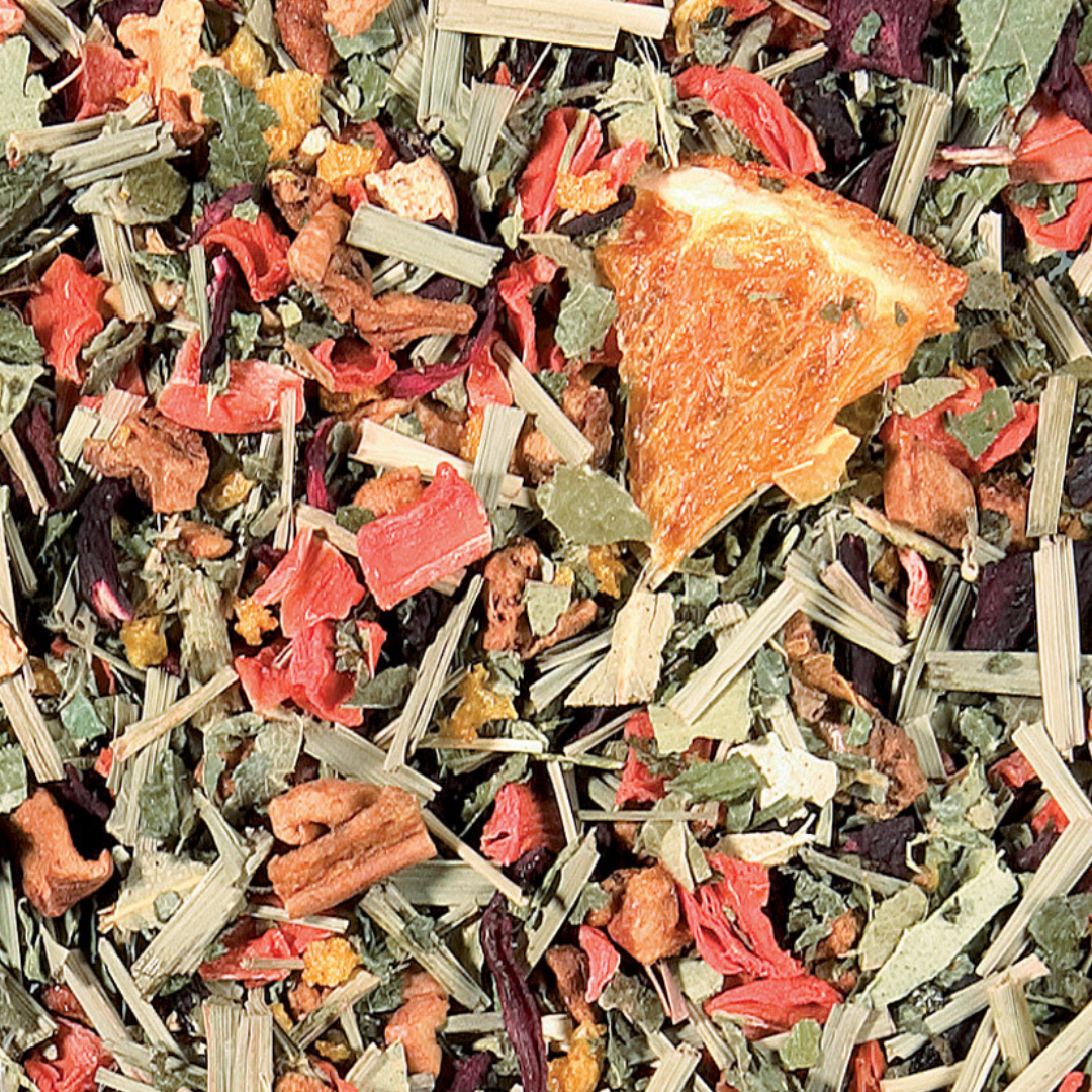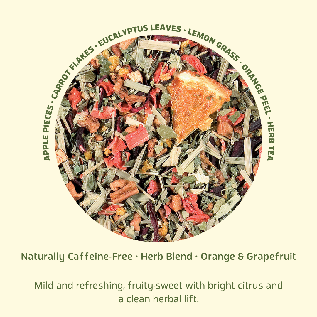 This mild creation is given fruity sweetness by apple pieces and carrot flakes and a touch of freshness by eucalyptus leaves, lemon grass, tangerine bits and a nuance of hibiscus. Beetroot pieces lend their colour to the cup along with a slightly earthy note. Dried orange slices are an optical reminder of the fresh citrus flavour of this absolutely perfect composition.