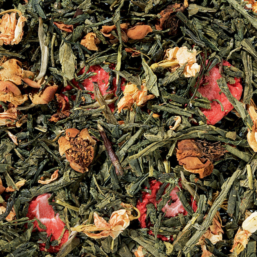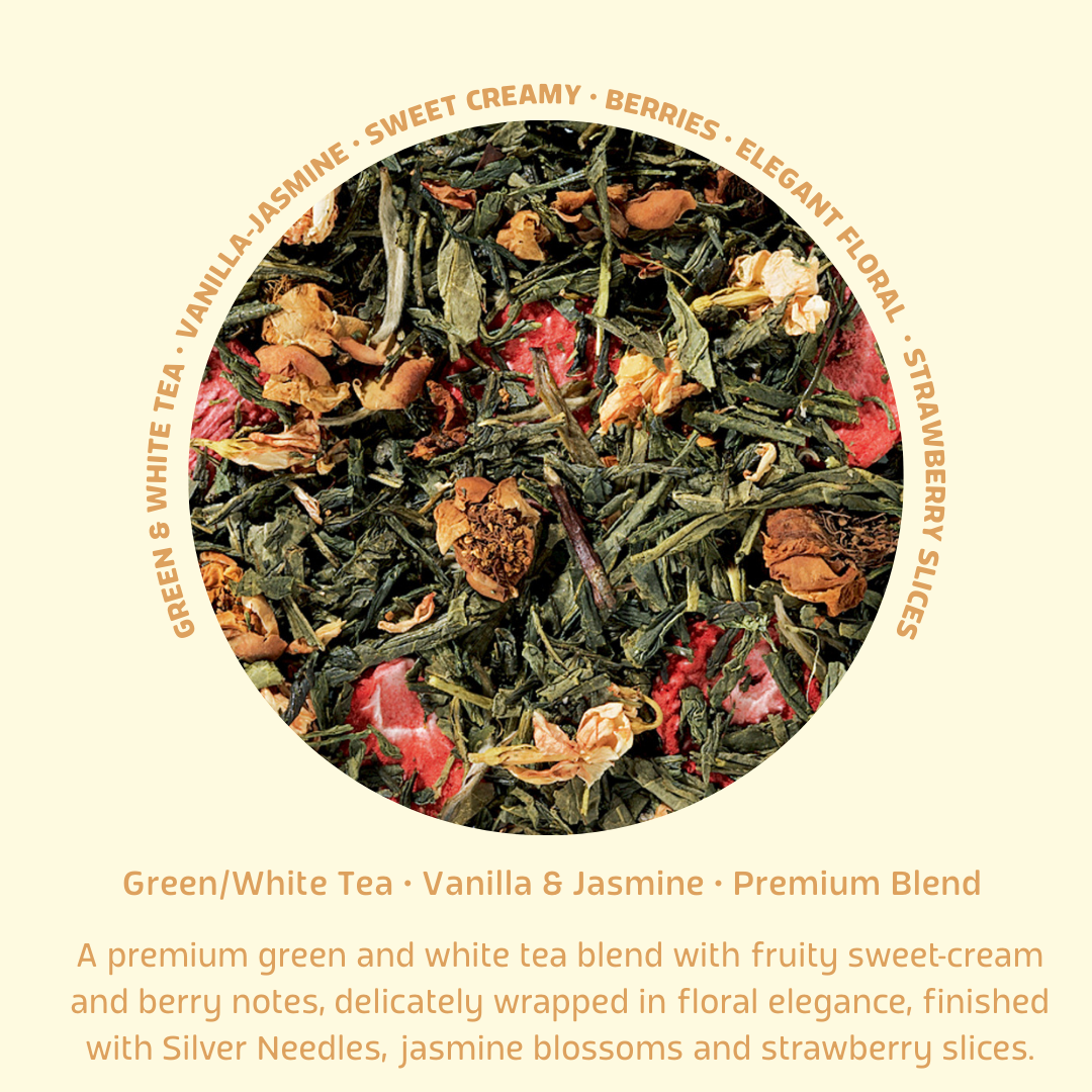 Flavours of fruity, sweet cream and a tasty portion of berries are enveloped delicately by a hint of flowers. A delicious lightness of true elegance is what we have achieved with this premium blend. The leaf appears very “chic” with fine Silver Needles and Jasmine blossoms add a charming chic. Strawberry slices complete the picture with a pretty touch of colour.